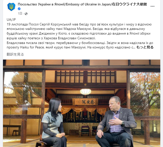 2022年11月、ウクライナのコルスンスキー駐日大使と黛まどかの京都での対談について、在日ウクライナ大使館のフェイスブックに掲載されました。ぜひご覧ください。